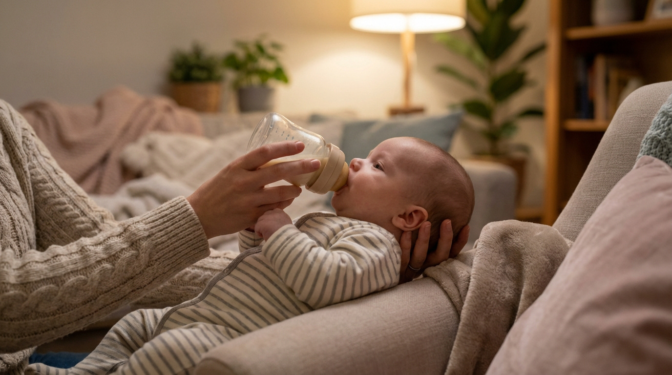 Un nourrisson aux yeux ouverts boit son biberon, tenu par les mains d'un adulte dans un salon chaleureux et intime.