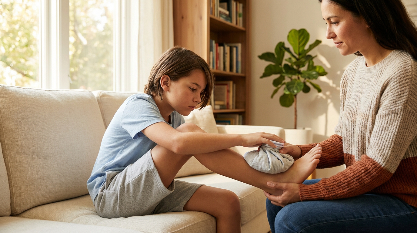 Enfant appliquant un pack de glace sur son talon, assisté par un adulte. Illustration du traitement de la maladie de Sever.